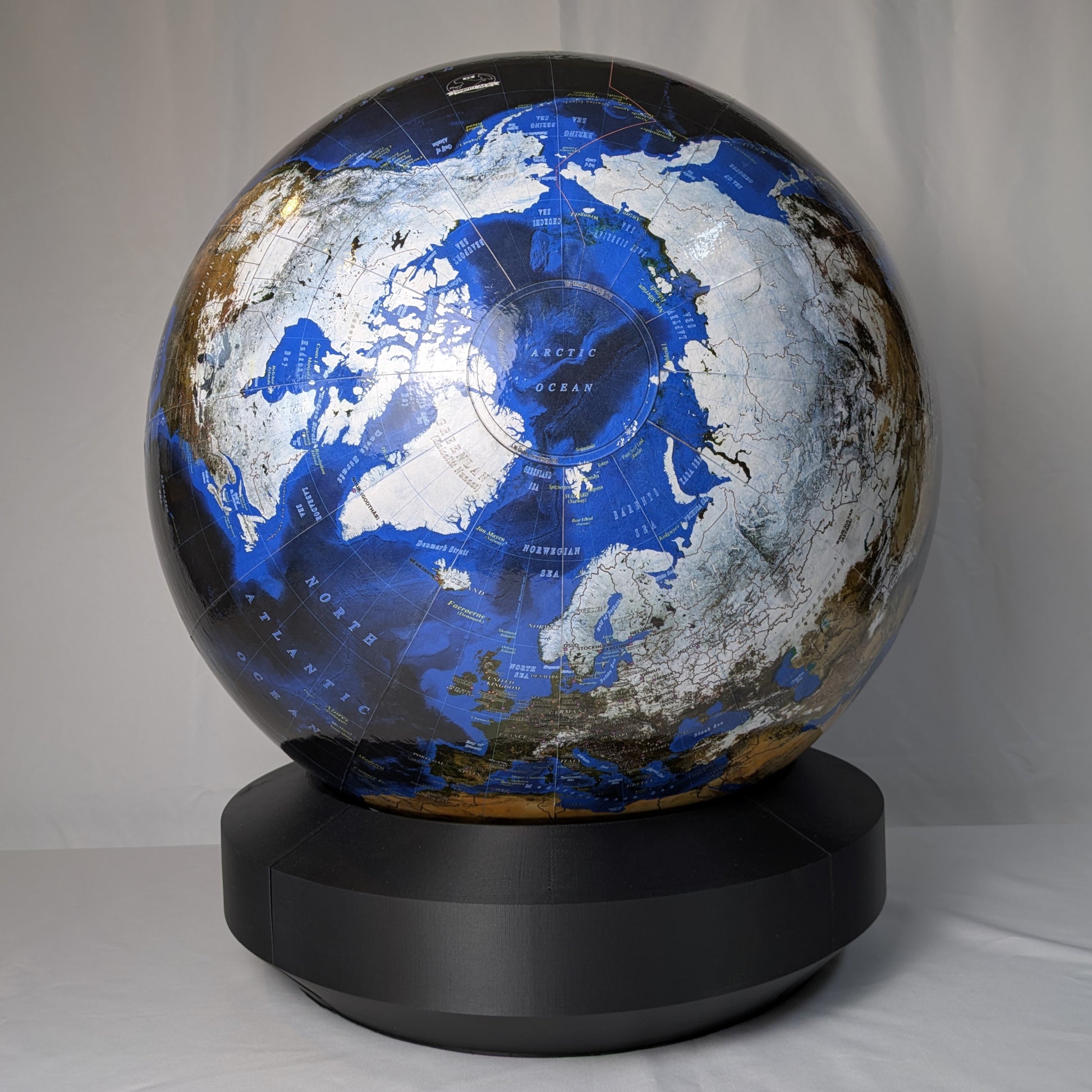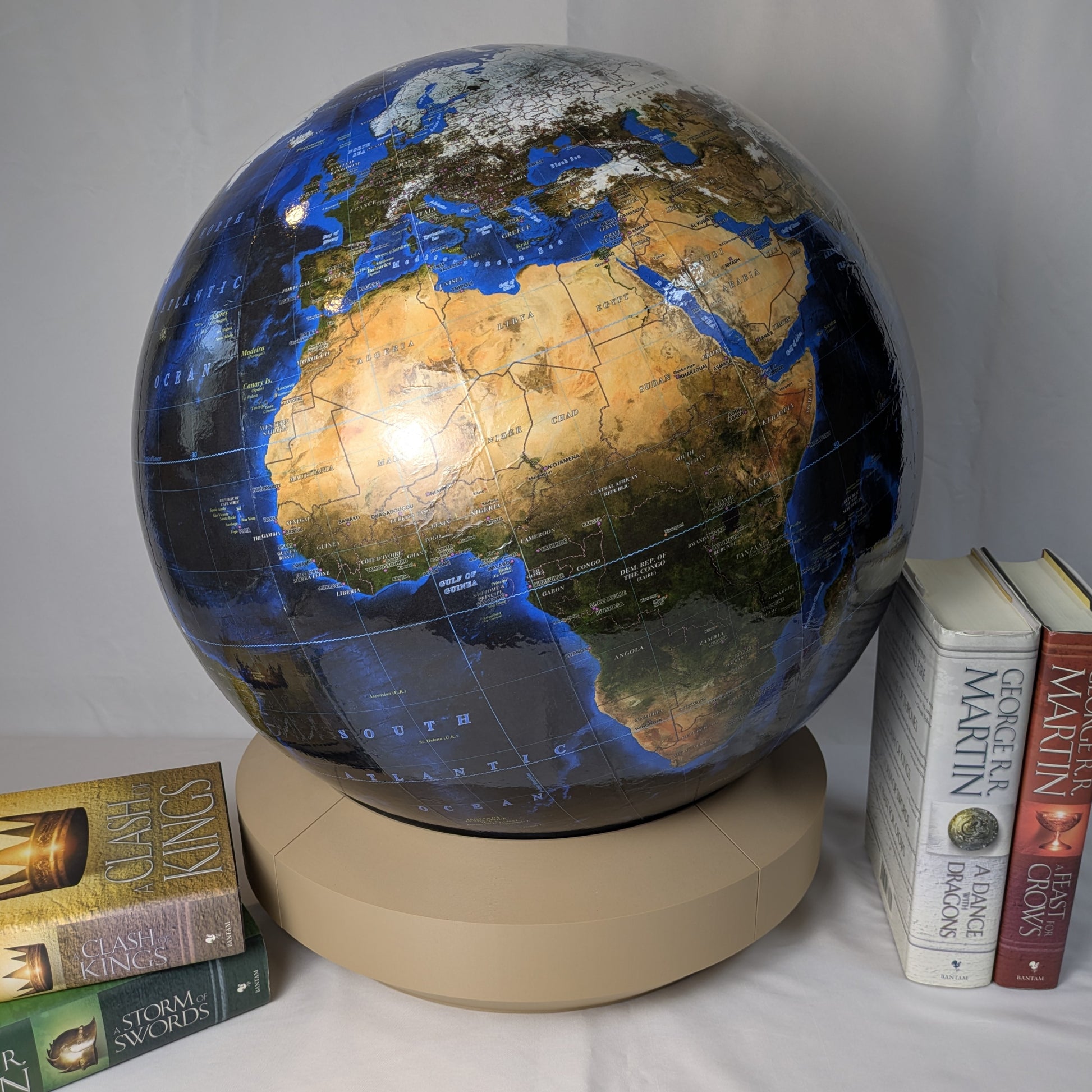50 cm (20 inch) diameter hand-crafted globe using satellite imagery taken in January 2004. Finished with a gloss coating, this globe has over 1500 text labels of Countries, Settlements, Island, Regions and Oceans with the intention of highlighting topography over labels.