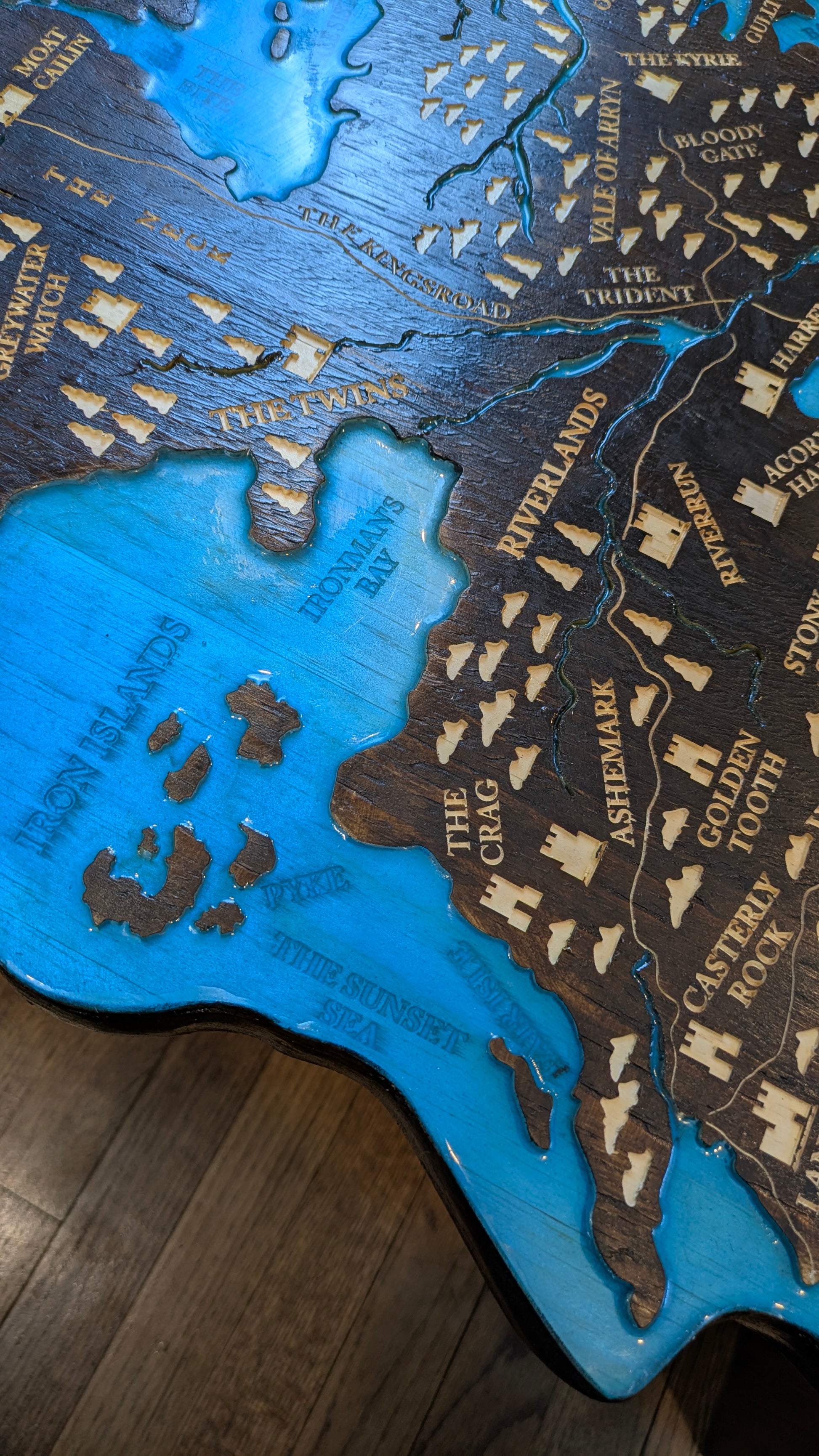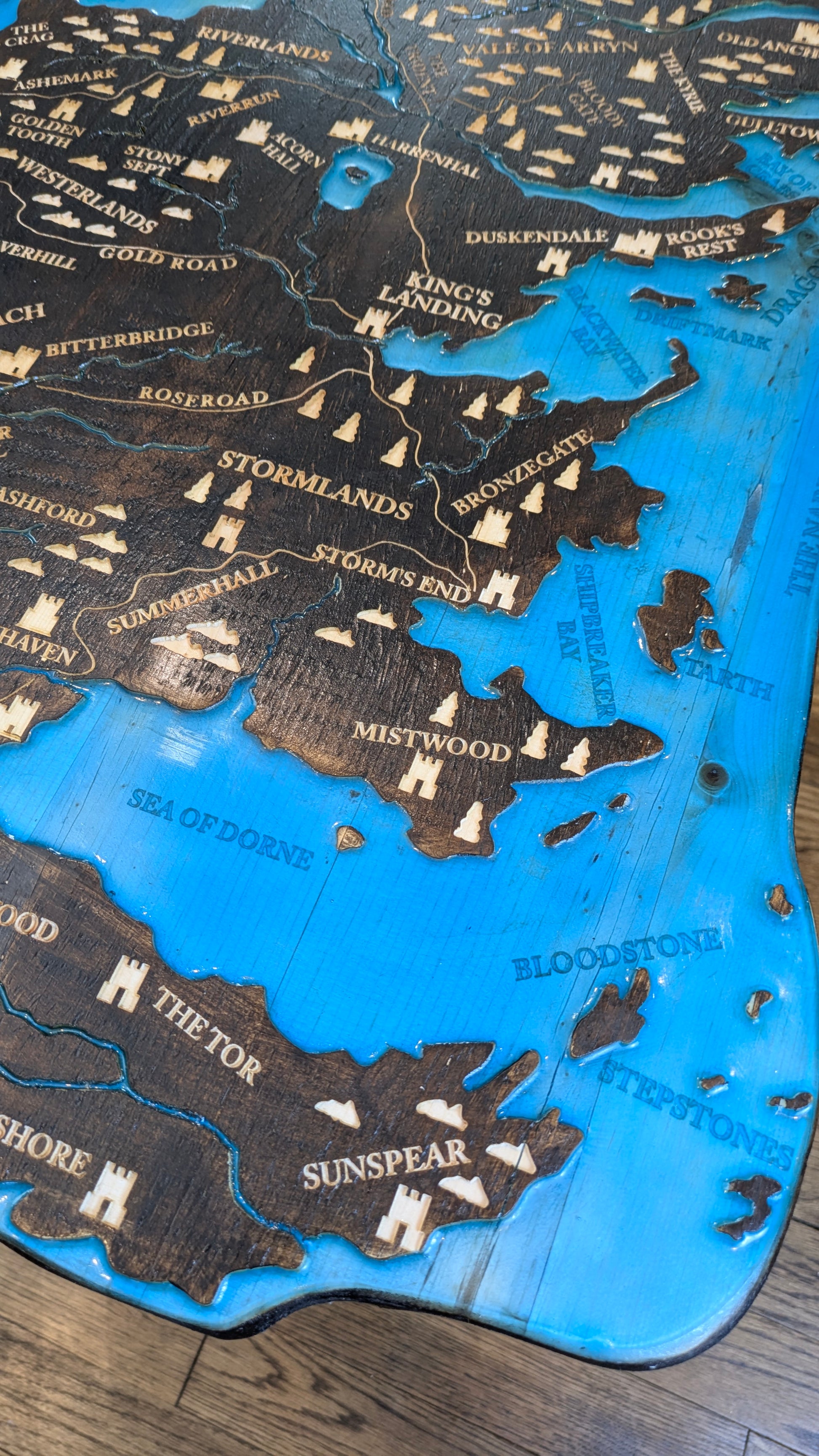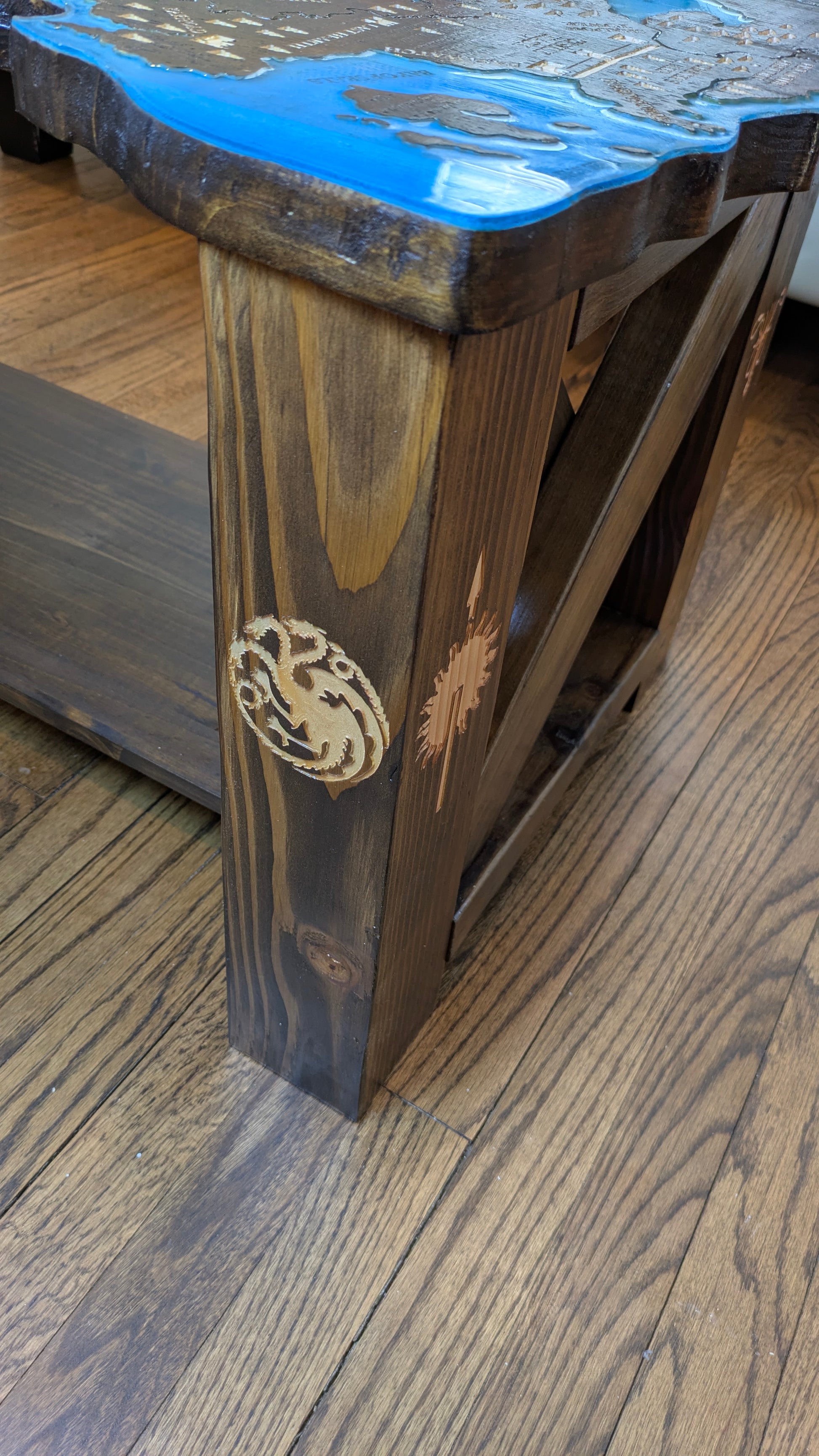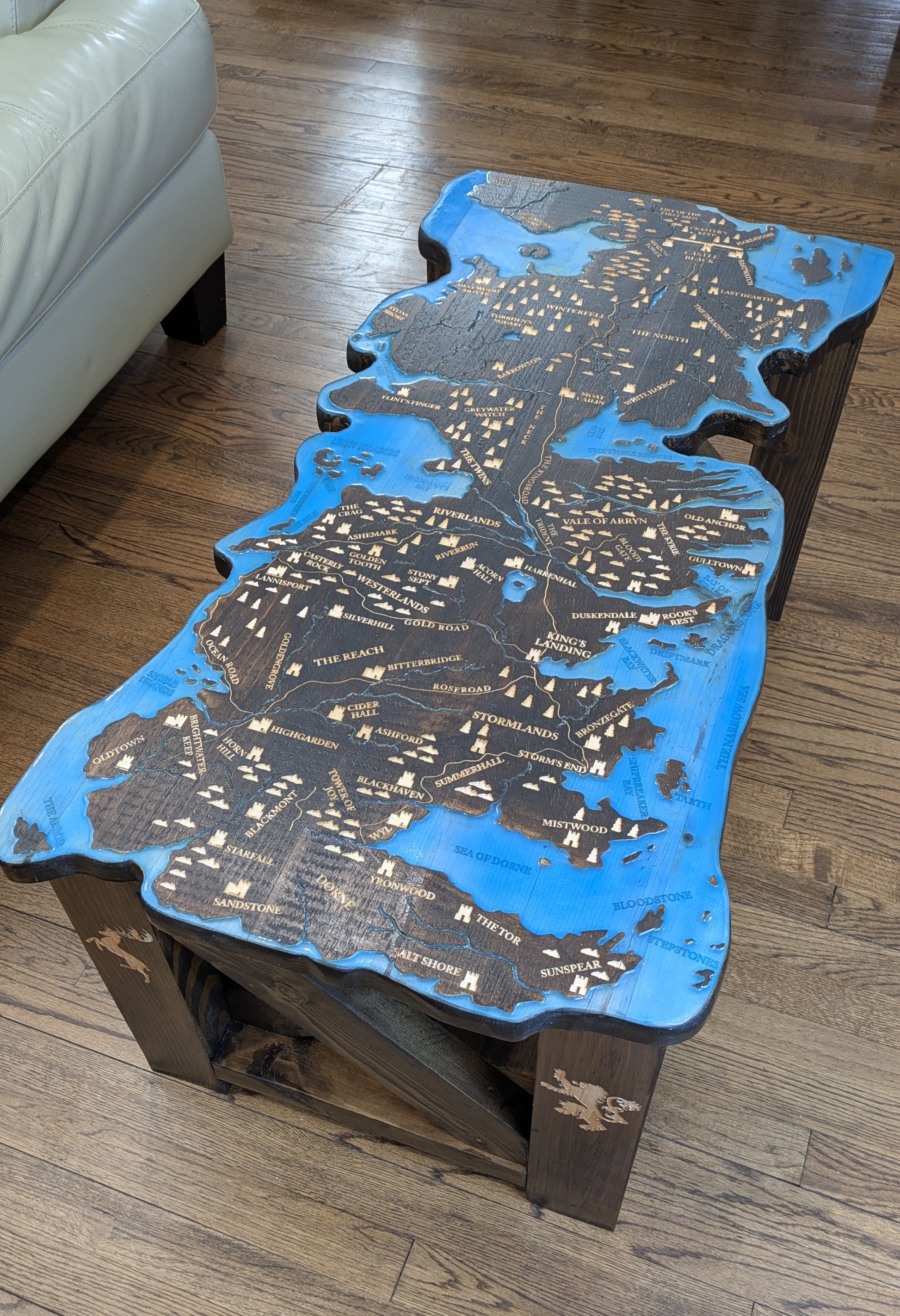 Inspired by the painted table at Dragonstone in Game of Thrones and House of the Dragon, this table has the map of Westeros carved into the top and an epoxy resin pour for the seas and rivers.