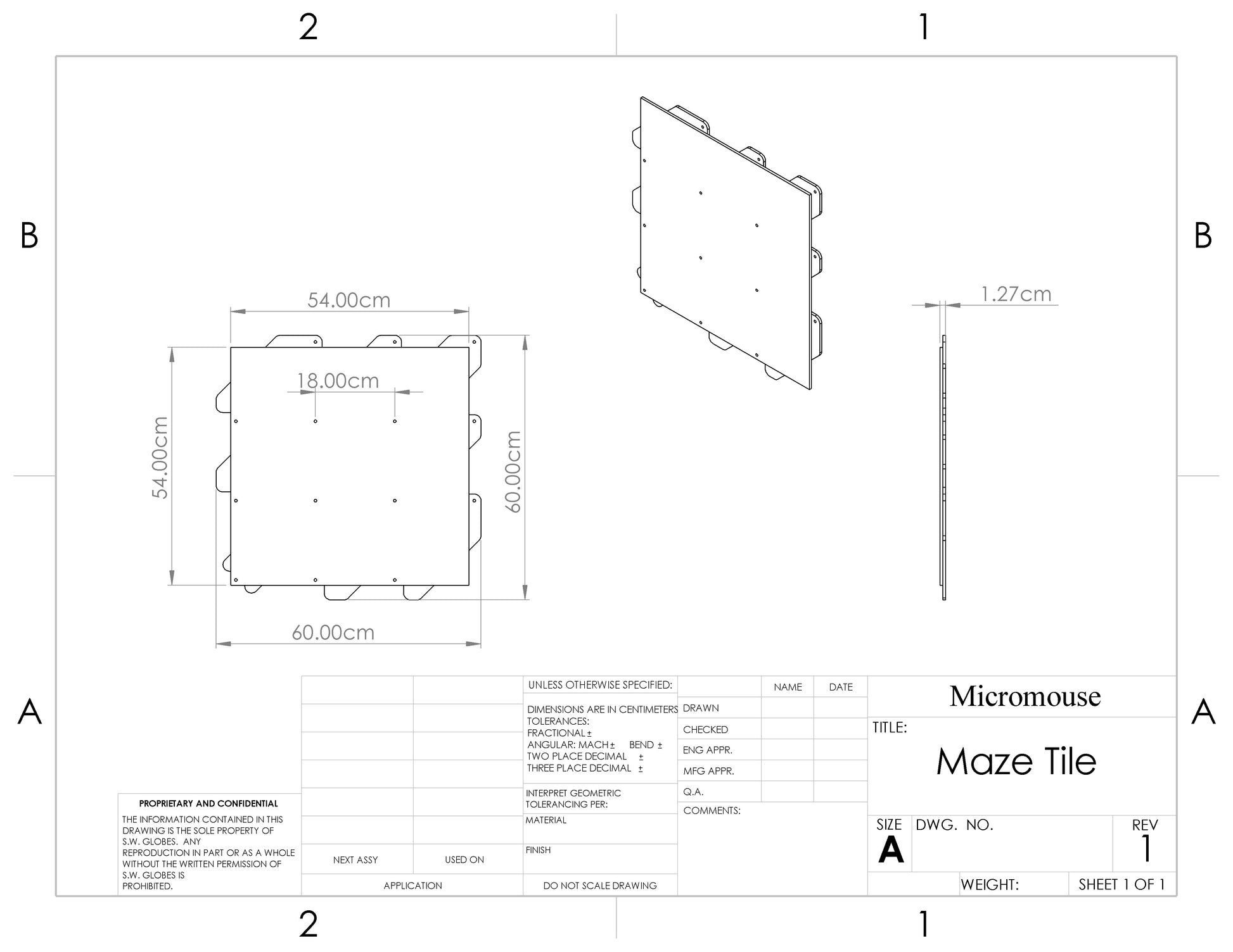 This maze tile is designed for use with micromouse robots. 36 identical tiles can be connected together to form a full size micromouse maze with a 16x16 grid of cells. The maze tiles have 6mm holes that are 18cm apart to conform to micromouse competition standards. Each tile is cut on a CNC machine for the highest level of precision.