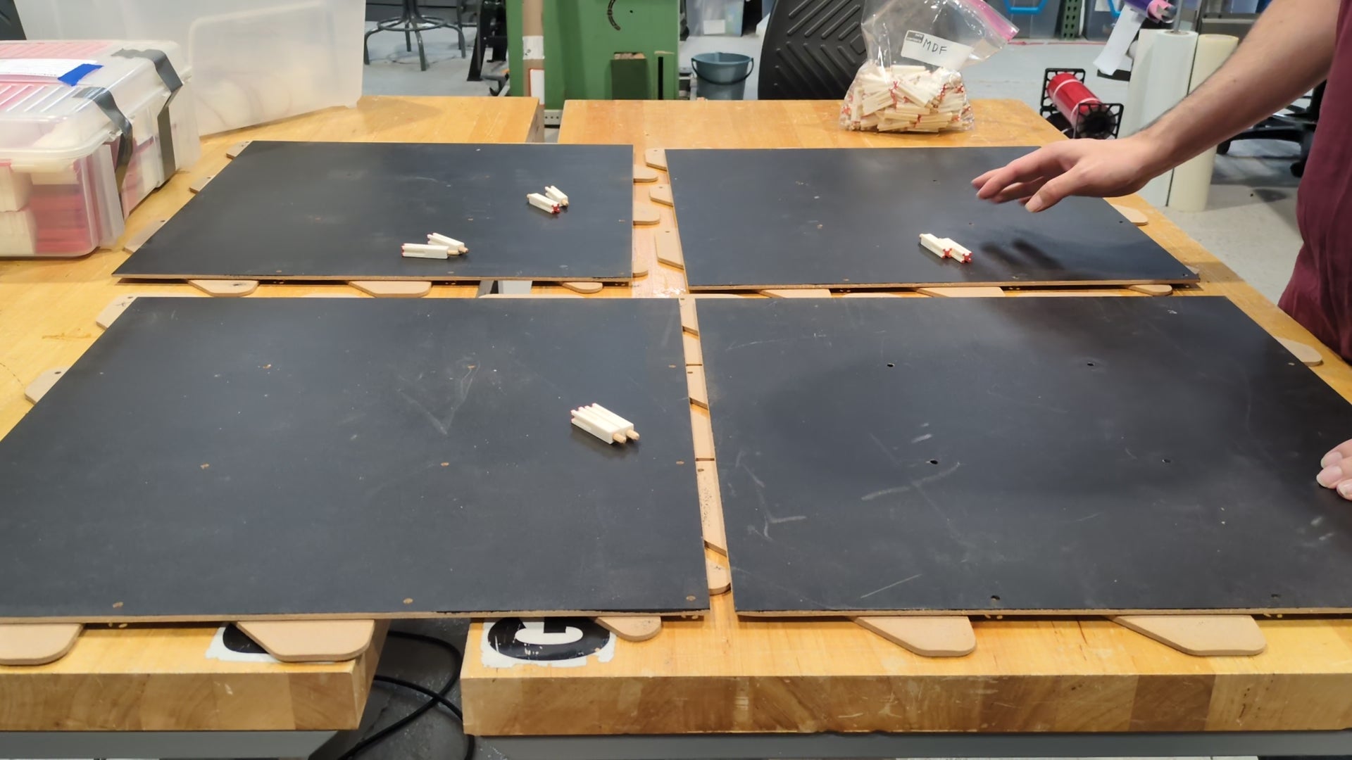 The maze tiles are made from MDF wood so they don't warp like regular plywood. Each tile has two layers that interlock with each other to ensure vertical alignment and smooth seams for robots to travel over. When inserting the pillars along a tile edge they lock adjacent tiles together.